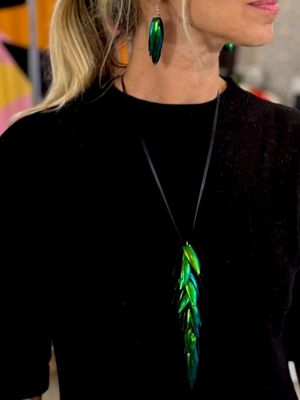 Brincos, colares e cuffs são criados com a intenção de oferecer produtos sustentáveis e ecológicos, utilizando asas de besouros naturalmente metalizadas, conchas nautilus e resinas naturais.